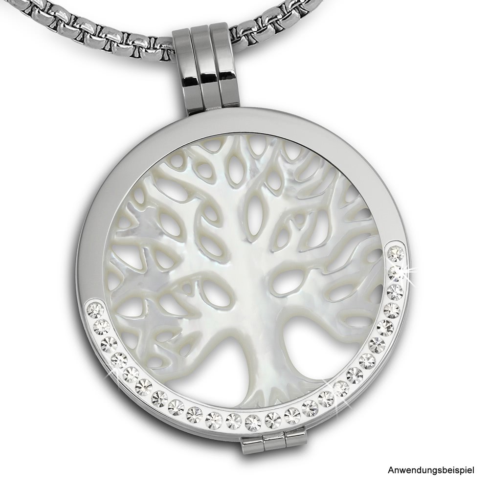 Der Coin Lebensbaum Perlmutt Schimmer in der Farbe weiß ist trendig und sehr hochwertig verarbeitet. Der Coin hat einen Durchmesser von 30mm und wird in eine Coinsfassung eingelegt. Der Coin ist ca 1mm dick und kann mit allen anderen Coins in 1mm Stärke kombiniert und als Doppelpack getragen werden. Es entsteht ein toller Effekt, da man verschiedene Edelstahlcoins mit 1mm Stärke drunter oder drüber legen kann. Man muss nur noch eine Kette durch fädeln und schon ist das individuelle Schmuckstück fertig.