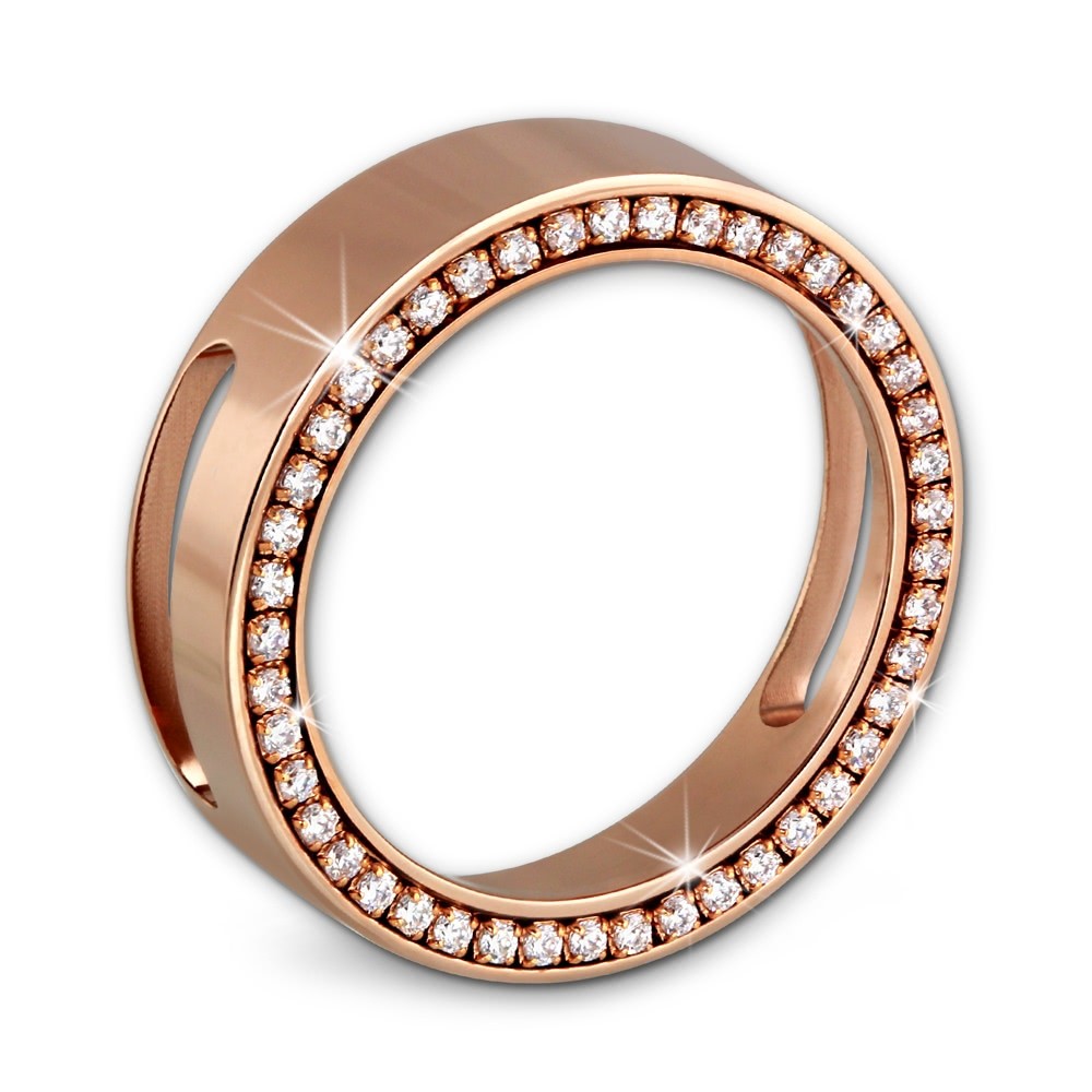 Die Edelstahl-Coinsfassung 25mm rosevergoldet mit Zirkonia weiß wird an einem Armband getragen. Die Fassung lässt sich auf ein Leder- oder Metallarmband fädeln.