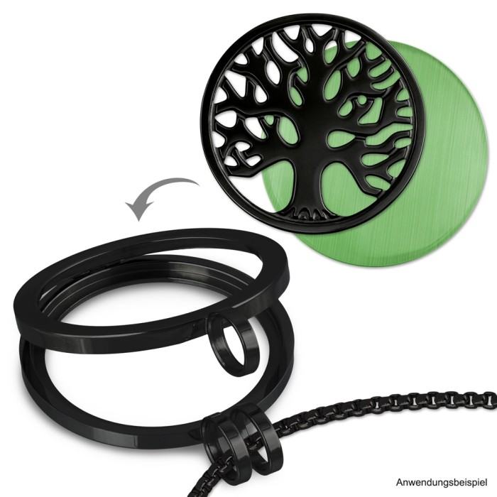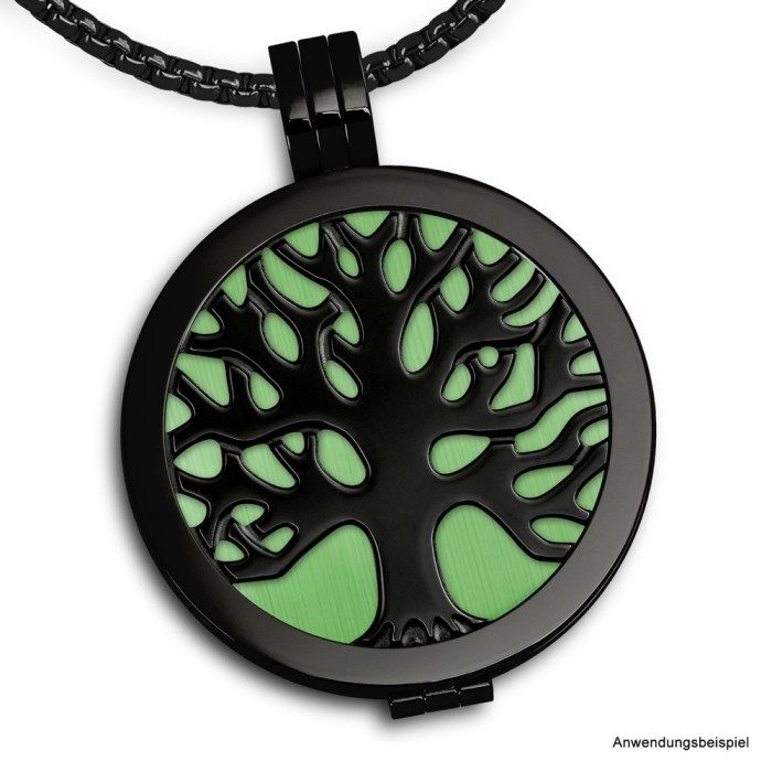 Der Edelstahl-Coin Lebensbaum in der Farbe schwarz ist trendig und sehr hochwertig verarbeitet. Der Coin hat einen Durchmesser von 30mm und wird in eine Coinsfassung eingelegt. Der Coin ist ca 1mm dick und kann mit allen anderen Coins in 1mm Stärke kombiniert und als Doppelpack getragen werden. Es entsteht ein toller Effekt, da man verschiede Farben und Materialien unterlegen kann, und diese dann durchscheinen. Man muss nur noch eine Kette durch fädeln und schon ist das individuelle Schmuckstück fertig.