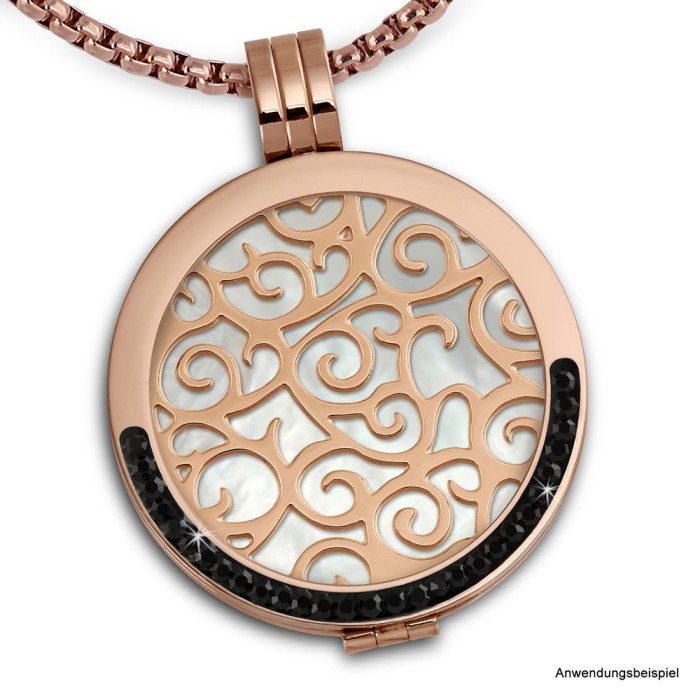 Der Edelstahl-Coin Ornament rosevergoldet ist trendig und sehr hochwertig verarbeitet. Der Coin ist mit 333er Rosegold im PVD Beschichtungsverfahren vergoldet. Er hat einen Durchmesser von 30mm und wird in eine Coinsfassung eingelegt. Der Coin ist ca 1mm dick und kann mit allen anderen Coins in 1mm Stärke kombiniert und als Doppelpack getragen werden. Es entsteht ein toller Effekt, da man verschiede Farben und Materialien unterlegen kann, und diese dann durchscheinen. Man muss nur noch eine Kette durch fädeln und schon ist das individuelle Schmuckstück fertig.