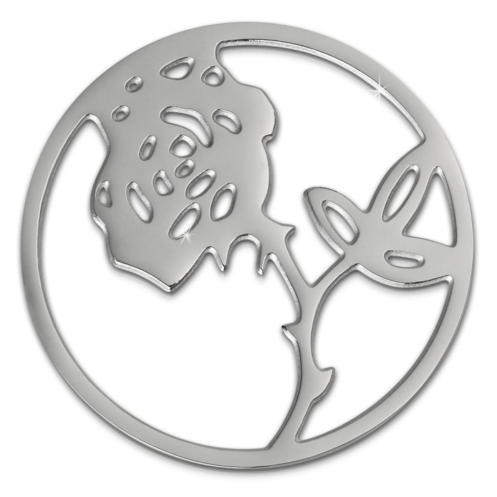 Der Edelstahl-Coin Rose in der Farbe silber (edelstahlfarben) ist trendig und sehr hochwertig verarbeitet. Der Coin hat einen Durchmesser von 30mm und wird in eine Coinsfassung eingelegt. Der Coin ist ca 1mm dick und kann mit allen anderen Coins in 1mm Stärke kombiniert und als Doppelpack getragen werden. Es entsteht ein toller Effekt, da man verschiede Farben und Materialien unterlegen kann, und diese dann durchscheinen. Man muss nur noch eine Kette durch fädeln und schon ist das individuelle Schmuckstück fertig.
