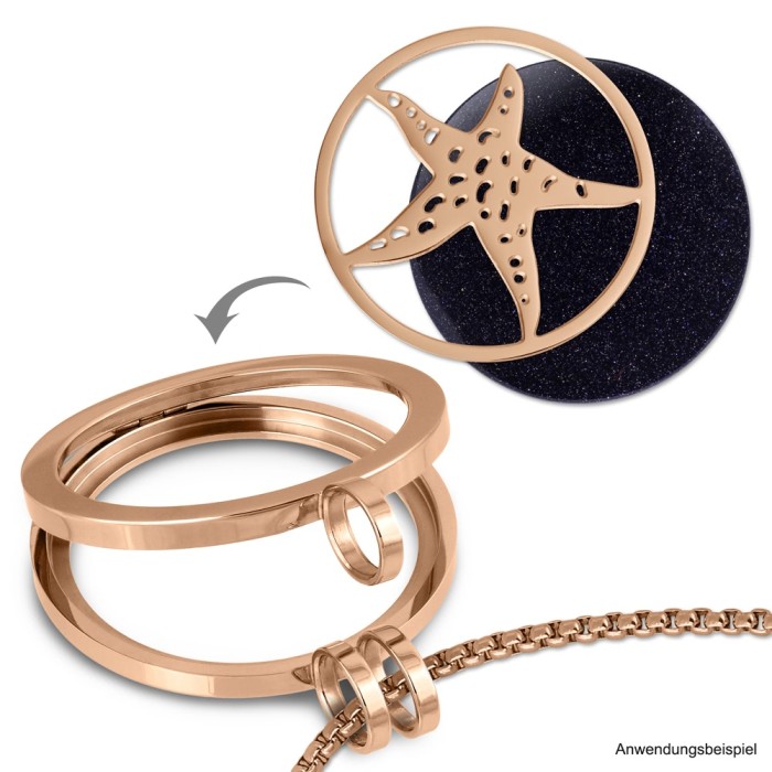 Der Edelstahl-Coin Seestern rosevergoldet ist trendig und sehr hochwertig verarbeitet. Der Coin ist mit 333er Rosegold im PVD Beschichtungsverfahren vergoldet. Er hat einen Durchmesser von 30mm und wird in eine Coinsfassung eingelegt. Der Coin ist ca 1mm dick und kann mit allen anderen Coins in 1mm Stärke kombiniert und als Doppelpack getragen werden. Es entsteht ein toller Effekt, da man verschiede Farben und Materialien unterlegen kann, und diese dann durchscheinen. Man muss nur noch eine Kette durch fädeln und schon ist das individuelle Schmuckstück fertig.