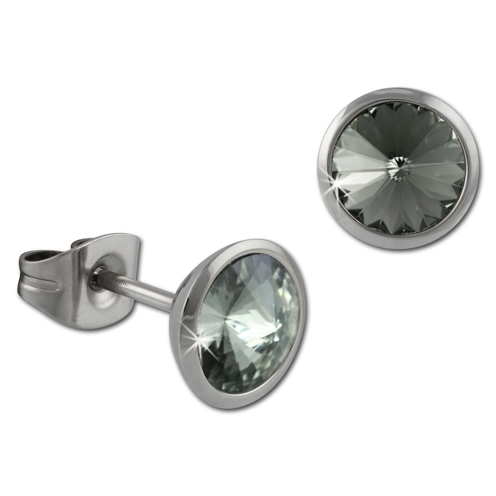 Ein Paar Edelstahl Ohrstecker rund mit einem grauen Zirkonias Stein für die modische, trendbewußte Frau. Die stylischen Ohrringe aus der Amello Edelstahl Kollektion glitzern und funkeln in der Farbe grau.