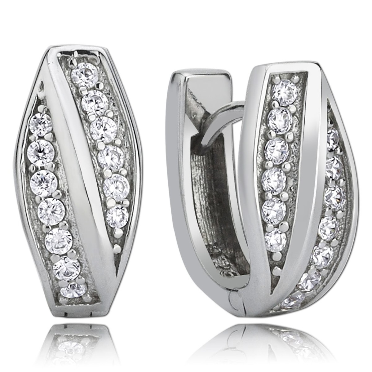 Elegante Damencreolen aus poliertem 925er Sterling Silber. Die Ohrringe sind mit funkelnden Zirkonia verziert. Durch die Form der Creolen werden die Ohrlöcher verdeckt.