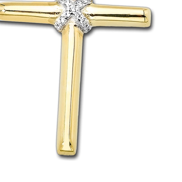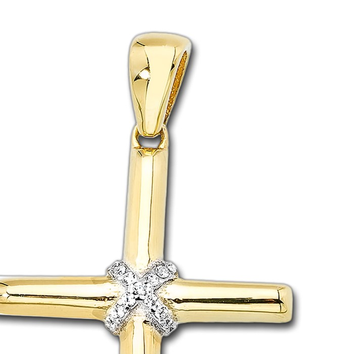 Trendiger Anhänger aus hochwertigem 333er Gelbgold gefertigt. Der Kettenanhänger hat die Form von einem Kreuz. Der Kreuz- Anhänger ist mit weißen Zirkonias besetzt.
