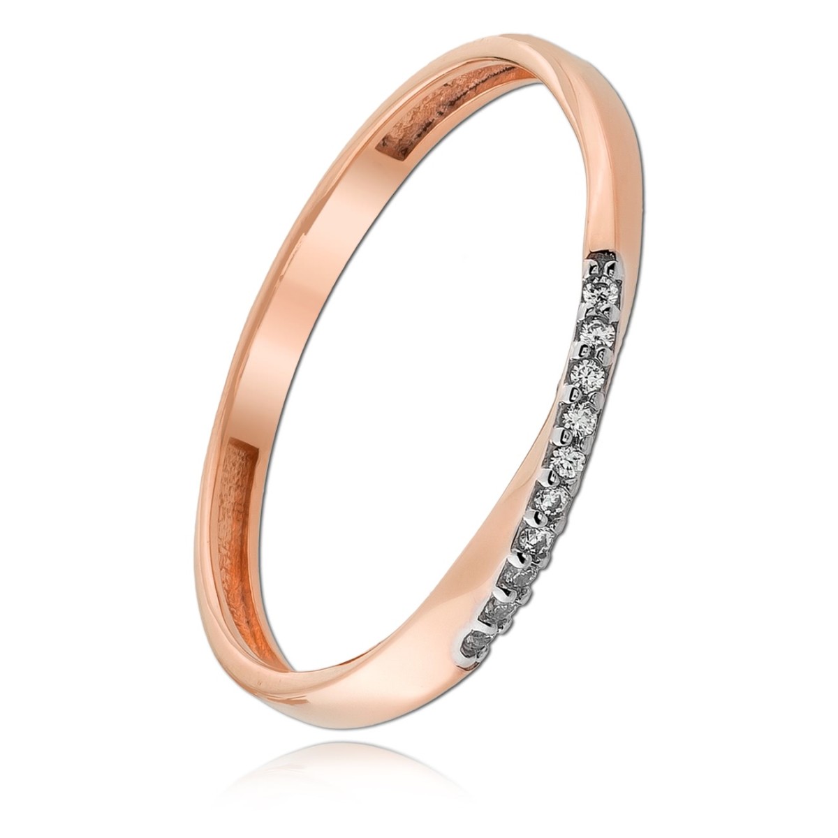 Moderner Ring Swing aus 333er Rosegold gefertigt. Die Ringschiene ist mit vielen kleinen weißen Zirkonias besetzt. Der Ring hat eine Größe von 54 (17,2).