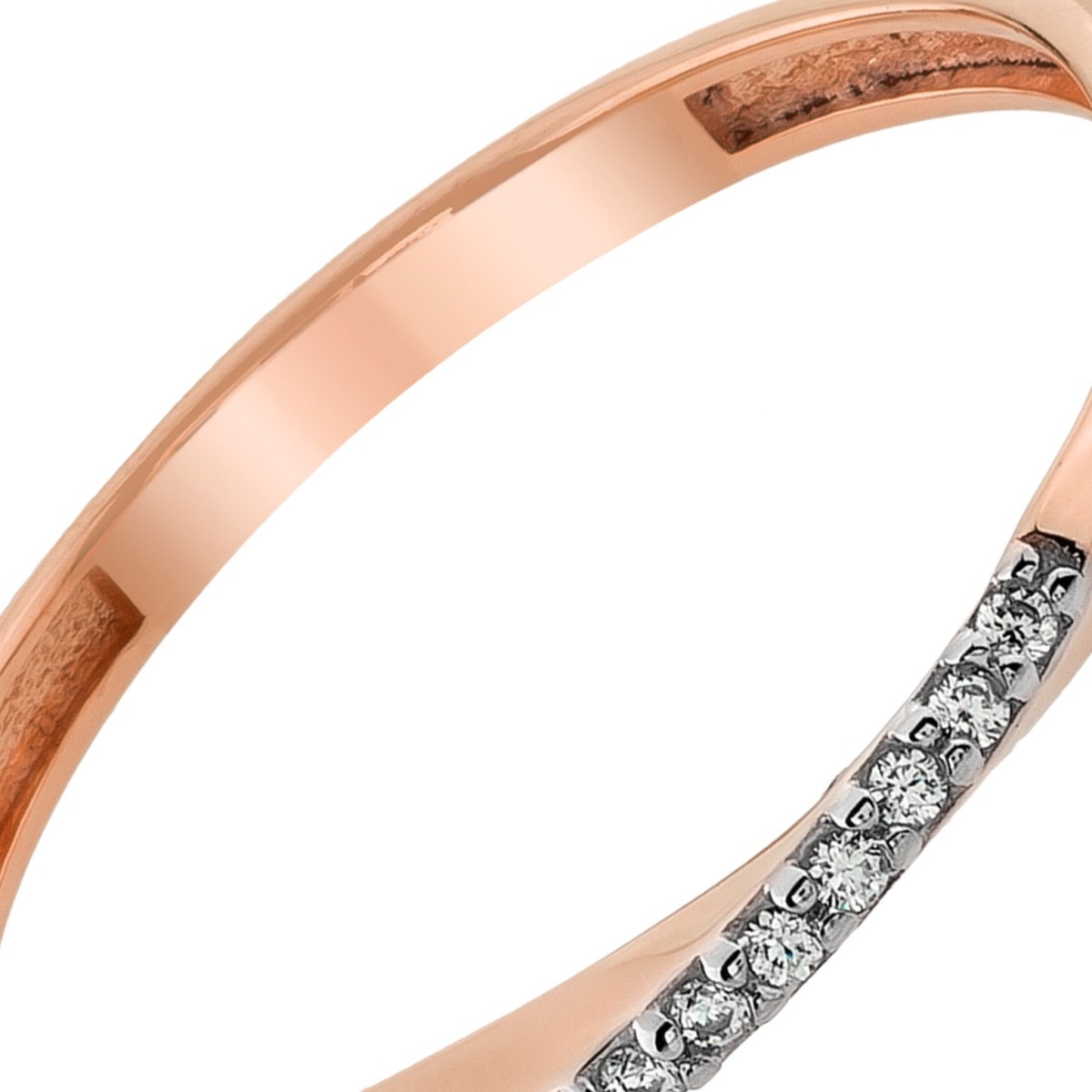 Moderner Ring Swing aus 333er Rosegold gefertigt. Die Ringschiene ist mit vielen kleinen weißen Zirkonias besetzt. Der Ring hat eine Größe von 56 (17,8).