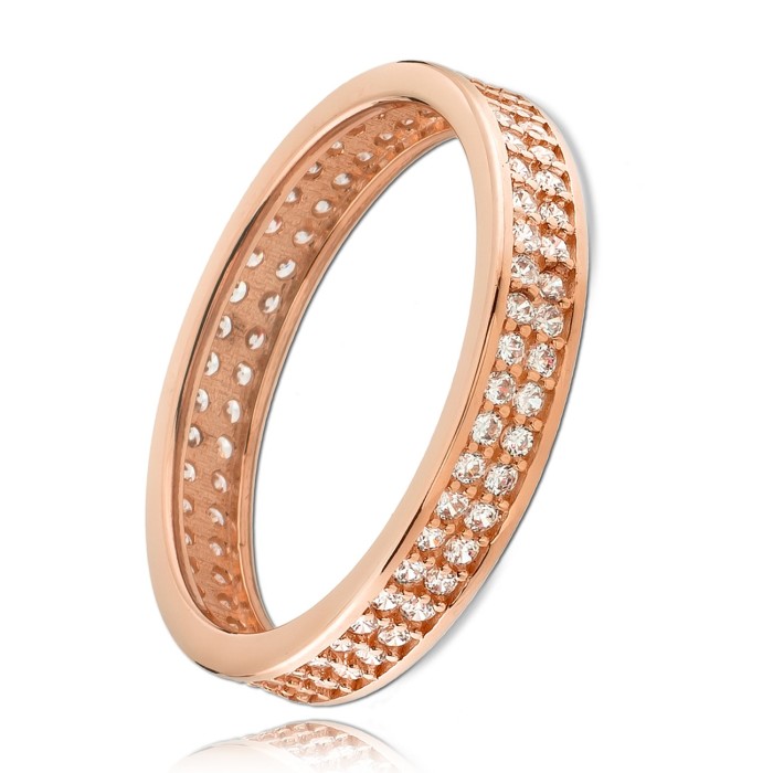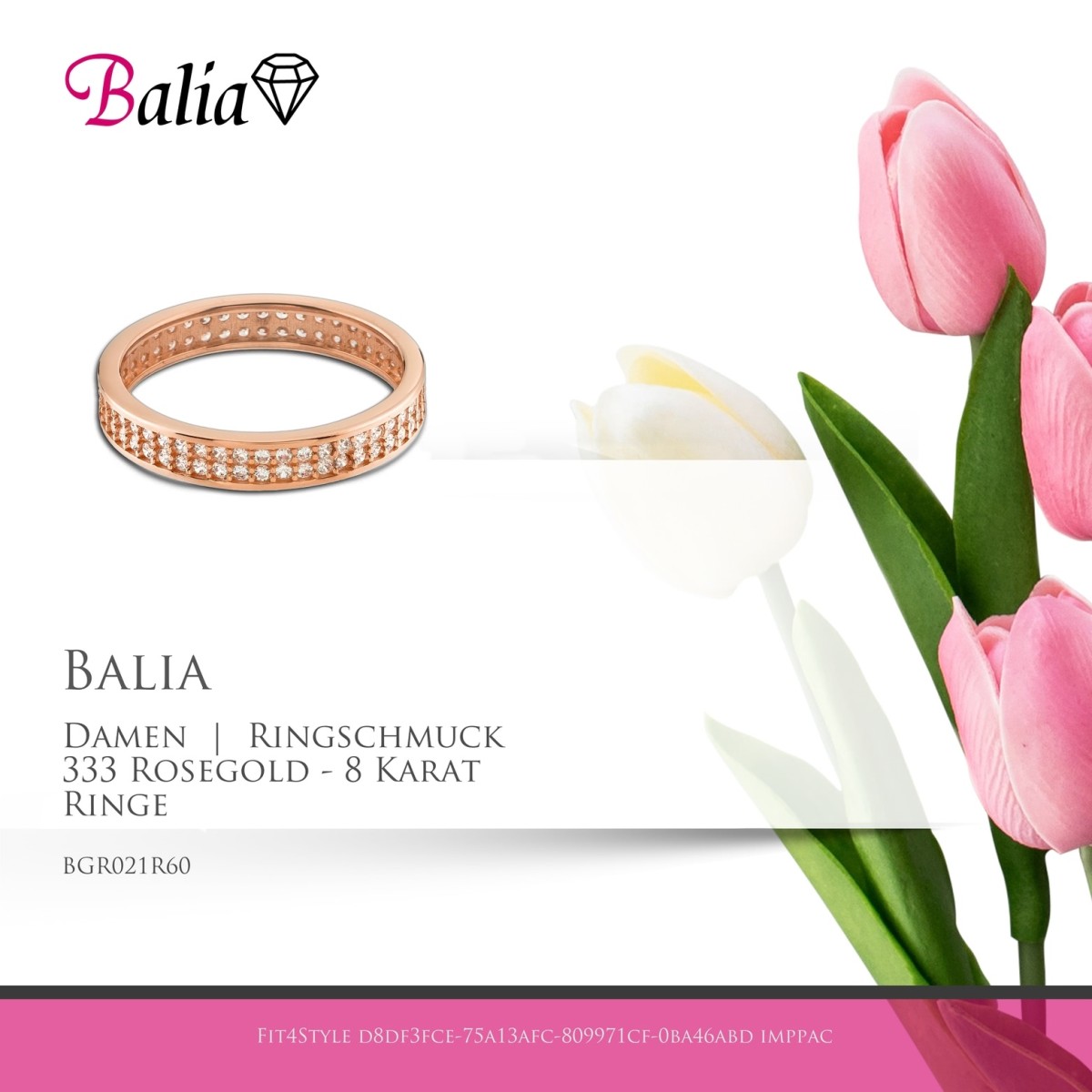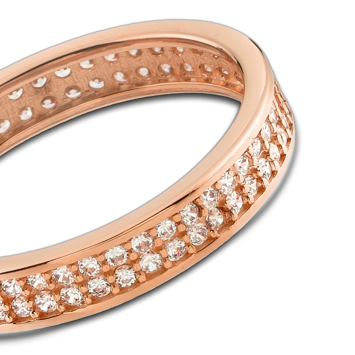 Hochwertiger Ring aus 333er Rosegold gefertigt. Die Ringschiene ist mit zwei Reihen funkelnden Zirkonias besetz. Der Ring hat eine Größe von 60 (19,1).