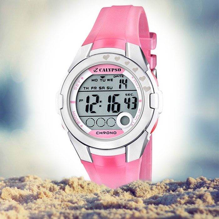 Die Funktionsuhr von Calypso hat ein rosanes Gehäuse aus Kunststoff mit grauem Zifferblatt. Das Kunststoffarmband ist zudem rosan. Die Uhr ist bis 10 bar wasserdicht und ist daher zum Duschen, Baden und Schwimmen optimal geeignet.- Zusatzinformation