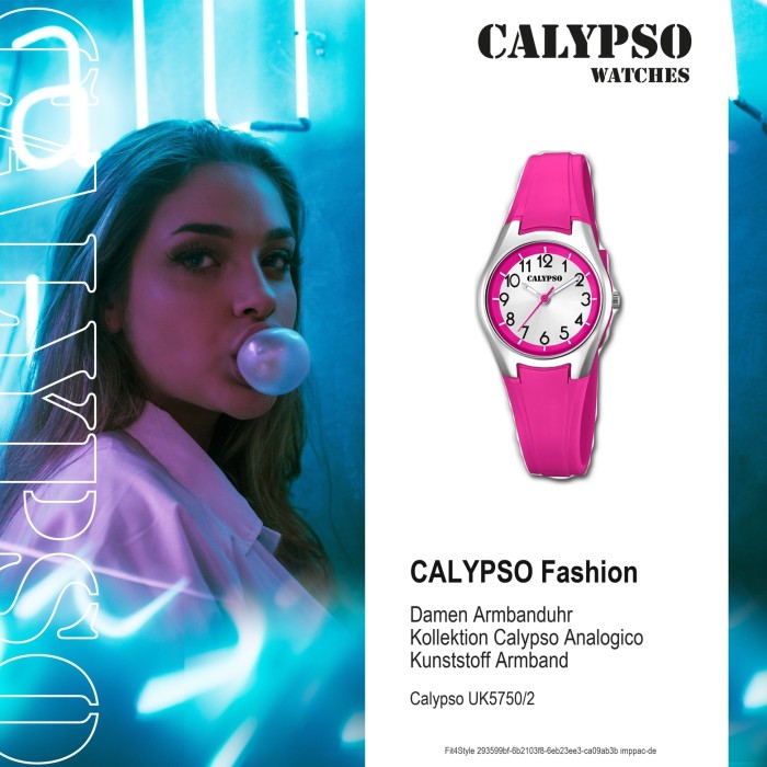 Modisch, sportlich und immer up to date - so zeigt sich auch diese stylische Uhr von Calypso. Die Fashion-Uhr K5750/2 für Damen verfügt über ein präzises Quarzwerk und ist bis 10 bar wasserdicht. Das hochwertige PU-Armband in pink garantiert einen hohen Tragekomfort zu einem unschlagbar günstigen Preis.- besondere Eigenschaften