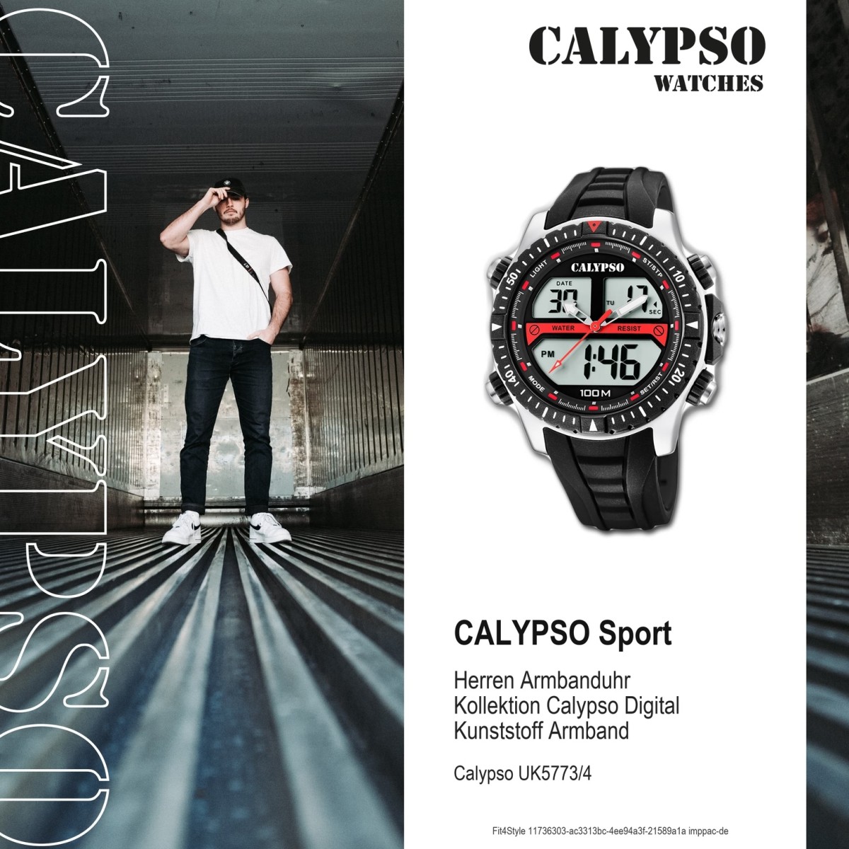 K5773/4 eine edle Uhr für Herren aus dem Hause Calypso mit schwarzem Armband aus Kunststoff und rot/schwarzem Zifferblatt. Die Uhr ist zum Duschen, Baden und Schwimmen optimal geeignet, weil sie eine Wasserdichtigkeit bis 10 bar besitzt.- Zusatzinformation