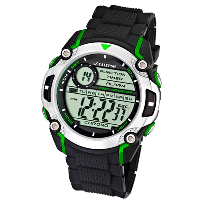 Sportlicher Calypso Herrenfunktionsuhr mit digitaler Anzeige und grünen Highlights. Diese Uhr für Herren wurde aus qualitativ hochwertigen, absolut hautverträglichen Materialien gefertigt.