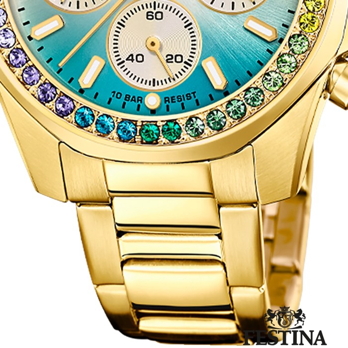 Diese einzigartige Uhr für Damen aus der aktuellen Festina Boyfriend Kollektion garantiert hohen Tragekomfort durch das hochwertige Edelstahl-Armband in gold. Der Chronograph ist ein zuverlässiger Begleiter in Alltag und Freizeit.- besondere Eigenschaften