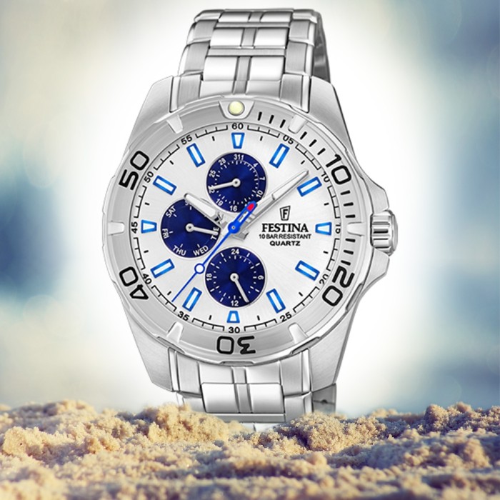 Die Uhren der FESTINA Multifunktion Kollektion wirken auf den ersten Blick wie Chronographen. Bei genauer Betrachtung sieht man, dass keine Zeit gestoppt wird, sondern Monat, Datum, Wochentag oder 24-Stunden angezeigt werden.