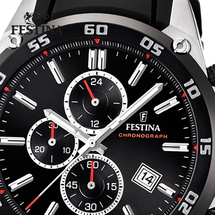 Eine Herrenuhr F20330/5 der Marke Festina mit schwarzem Armband aus edlem Kunststoff. Das Uhrenarmband wird mit einer Dornschließe fest verschlossen.- Zusatzinformation