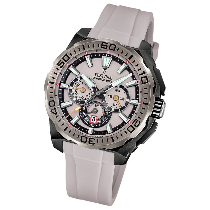 Die ?Chrono Bike? Kollektion von Festina sind sportliche Uhren, die vom Radsport inspiriert sind. Sie haben ein robustes Gehäuse, ein leuchtendes Zifferblatt, ein präzises Quarzwerk und ein sportliches Armband.
