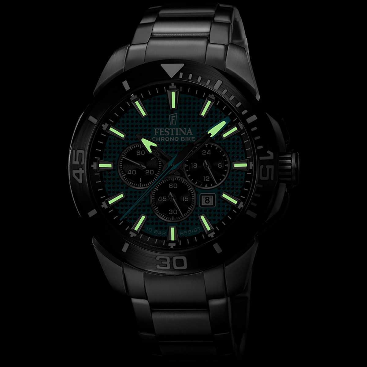 Die -Chrono Bike- Kollektion von Festina sind sportliche Uhren, die vom Radsport inspiriert sind. Sie haben ein robustes Gehäuse, ein leuchtendes Zifferblatt, ein präzises Quarzwerk und ein sportliches Armband.