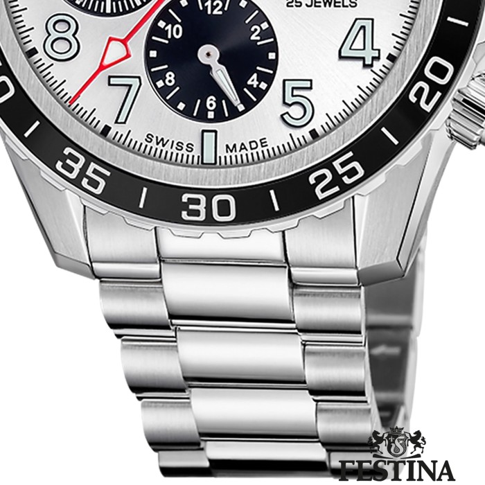 Diese einzigartige Uhr für Herren aus der aktuellen Festina Swiss Made Kollektion garantiert hohen Tragekomfort durch das hochwertige Edelstahl-Armband in silber. Die Multifunktionsuhr ist ein zuverlässiger Begleiter in Alltag und Freizeit.- besondere Eigenschaften