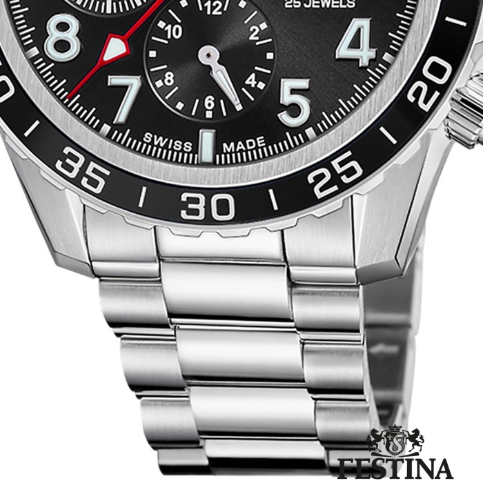 Diese einzigartige Uhr für Herren aus der aktuellen Festina Swiss Made Kollektion garantiert hohen Tragekomfort durch das hochwertige Edelstahl-Armband in silber. Die Multifunktionsuhr ist ein zuverlässiger Begleiter in Alltag und Freizeit.- besondere Eigenschaften