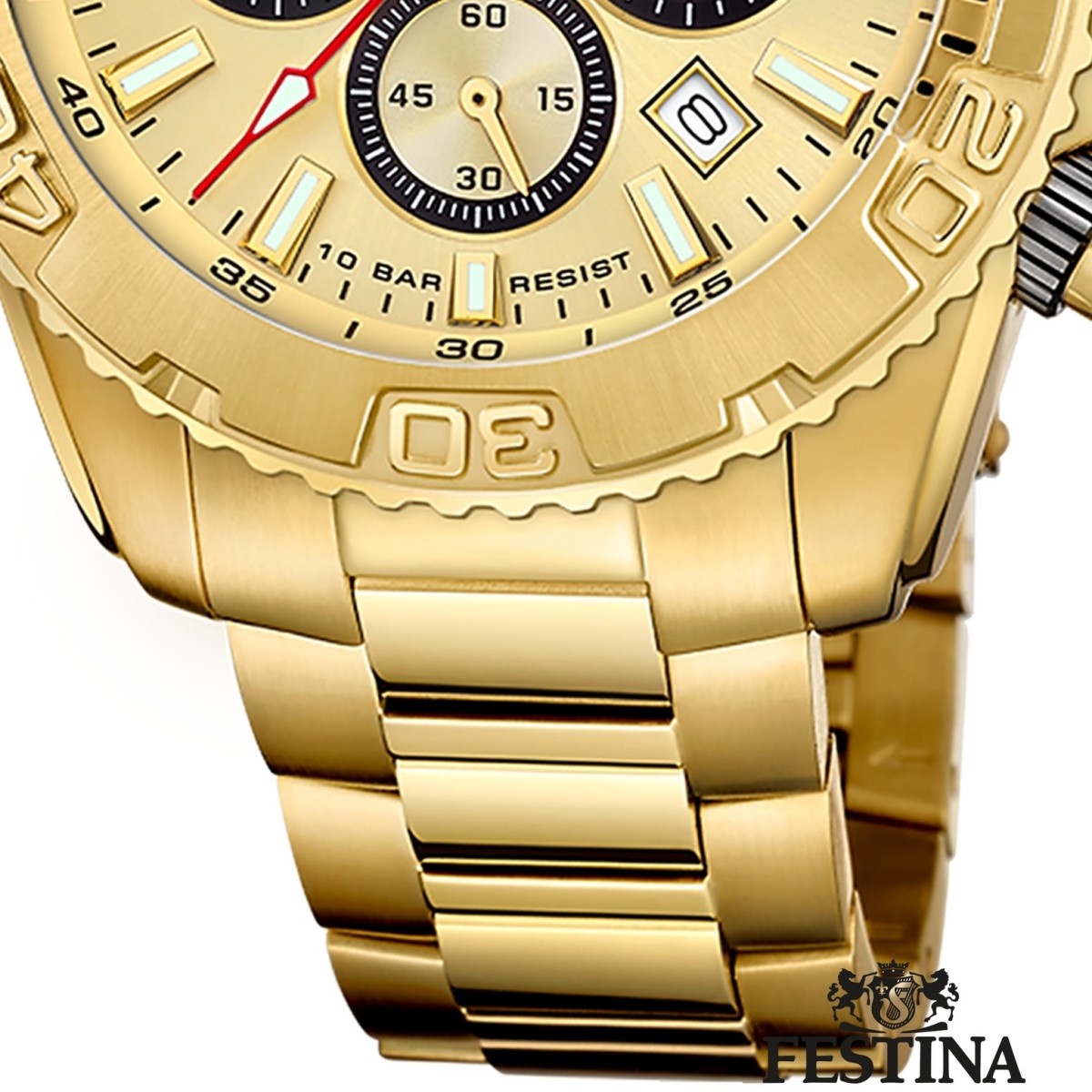 Diese einzigartige Uhr für Herren aus der aktuellen Festina Timeless Chronograph Kollektion garantiert hohen Tragekomfort durch das hochwertige Edelstahl-Armband in gold. Der Chronograph ist ein zuverlässiger Begleiter in Alltag und Freizeit.- besondere Eigenschaften
