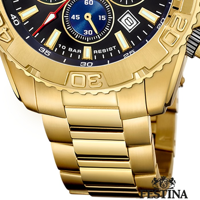 Diese einzigartige Uhr für Herren aus der aktuellen Festina Timeless Chronograph Kollektion garantiert hohen Tragekomfort durch das hochwertige Edelstahl-Armband in gold. Der Chronograph ist ein zuverlässiger Begleiter in Alltag und Freizeit.- besondere Eigenschaften