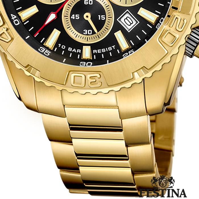 Diese einzigartige Uhr für Herren aus der aktuellen Festina Timeless Chronograph Kollektion garantiert hohen Tragekomfort durch das hochwertige Edelstahl-Armband in gold. Der Chronograph ist ein zuverlässiger Begleiter in Alltag und Freizeit.- besondere Eigenschaften