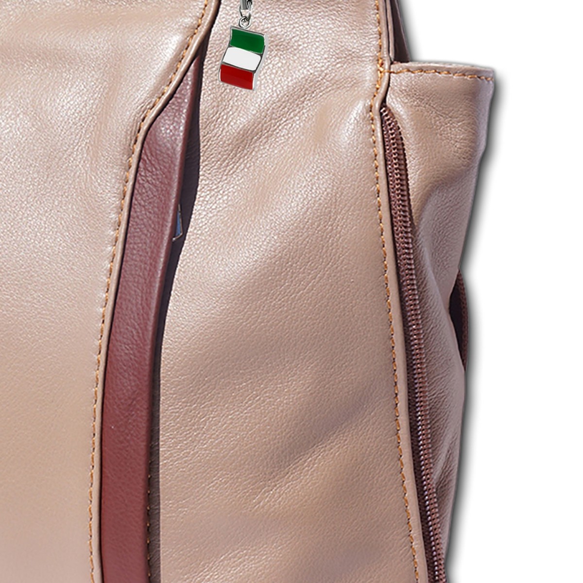 Moderne, multifunktionale Kombination aus Schultertasche und Damen-Rucksack handgefertigt aus echtem Leder - Made in Italy. Durch verschieben der Trageriemen erhalten Sie eine Umhängetasche oder einen Cityrucksack. An den Seiten sind zwei Reißverschlüsse, die zur Erweiterung des Fassungsvermögen dienen. Außerdem sind aus der vorderen Seite der Tasche zwei verdeckte Fächer mit Reißverschlüssen und hinten auch ein Fach mit Reißverschluss. Egal, ob Handtasche oder Rucksack, sie haben beides in einem!- besondere Eigenschaften