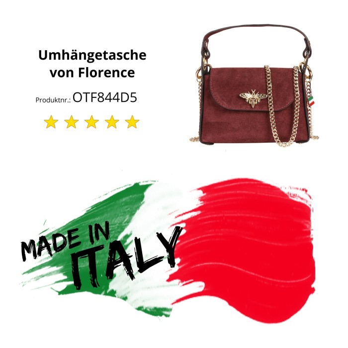 Die sehr schöne Wildleder Florence Marken-Tasche passt in die aktuelle Damenmode, ist bequem zu tragen und ist gut kombinierbar. Sie kommt in der ansprechenden Farbe bordeauxrot und ist mit einem Schnappverschluss sicher verschlossen.- Zusatzinformation