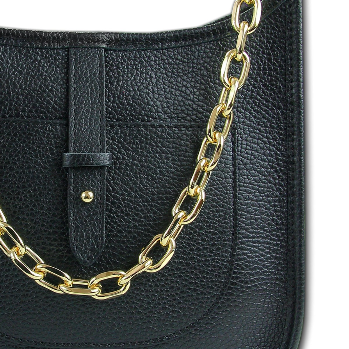 Trendige modische Umhängetasche aus echtem Leder mit einer goldenen Kette und einen langen Canvas-Schultergurt. Mit dieser leichten und kompakten Tasche kommen sie problemlos durch den Tag. Tragen sie die Tasche mit der goldenen Kette in der Hand oder mit dem Gurt diagonal am Körper.