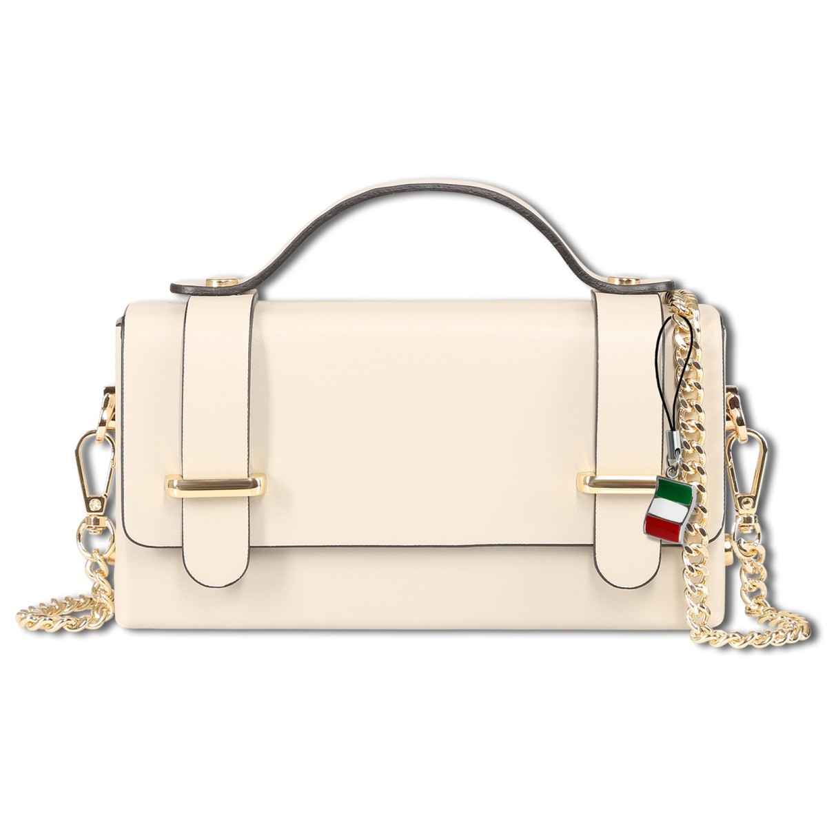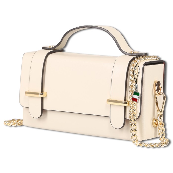 Diese modische Mini-Handtasche besticht durch ihre geometrische Box-Form und ist Made in Italy. Sie wird mit einem magnetischen Überschlagverschluss verschlossen und hat schöne dekorative Doppelschnallen. Diese handgefertigte Tasche aus echtem Leder begleitet dich durch den Tag und durch die Nacht. Tragen Sie sie quer am Körper für einen modischen Look oder lässig in der Hand. Diese kompakte Ledertasche hat eine Länge von 19cm.- besondere Eigenschaften