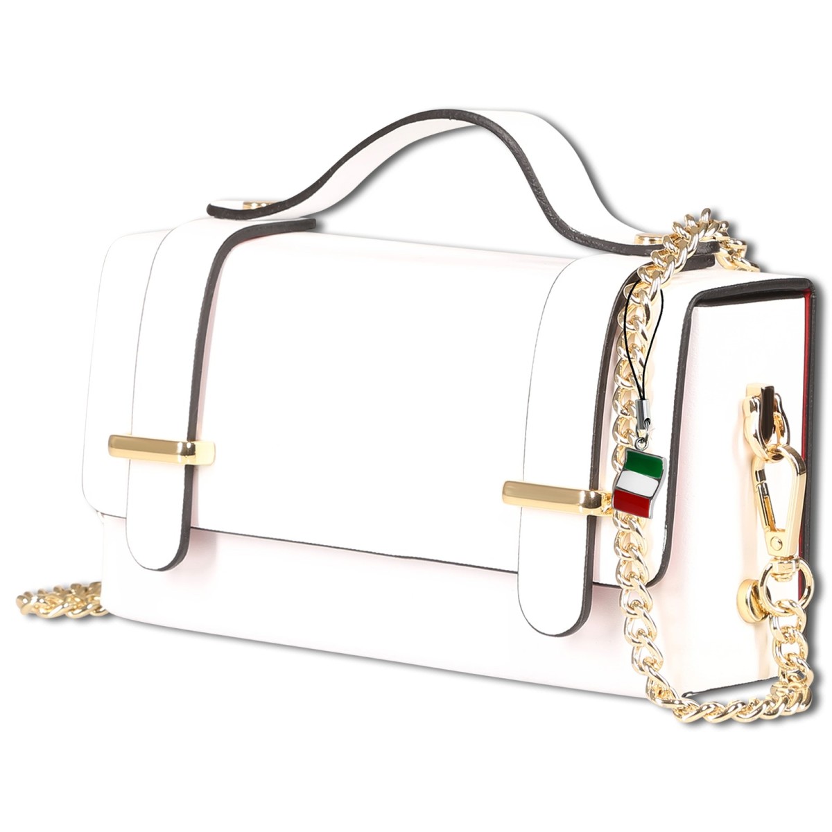 Diese modische Mini-Handtasche besticht durch ihre geometrische Box-Form und ist Made in Italy. Sie wird mit einem magnetischen Überschlagverschluss verschlossen und hat schöne dekorative Doppelschnallen. Diese handgefertigte Tasche aus echtem Leder begleitet dich durch den Tag und durch die Nacht. Tragen Sie sie quer am Körper für einen modischen Look oder lässig in der Hand. Diese kompakte Ledertasche hat eine Länge von 19cm.- besondere Eigenschaften