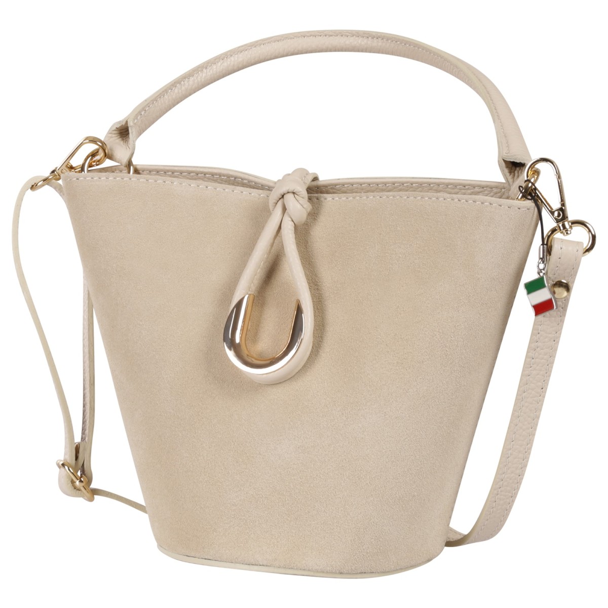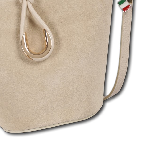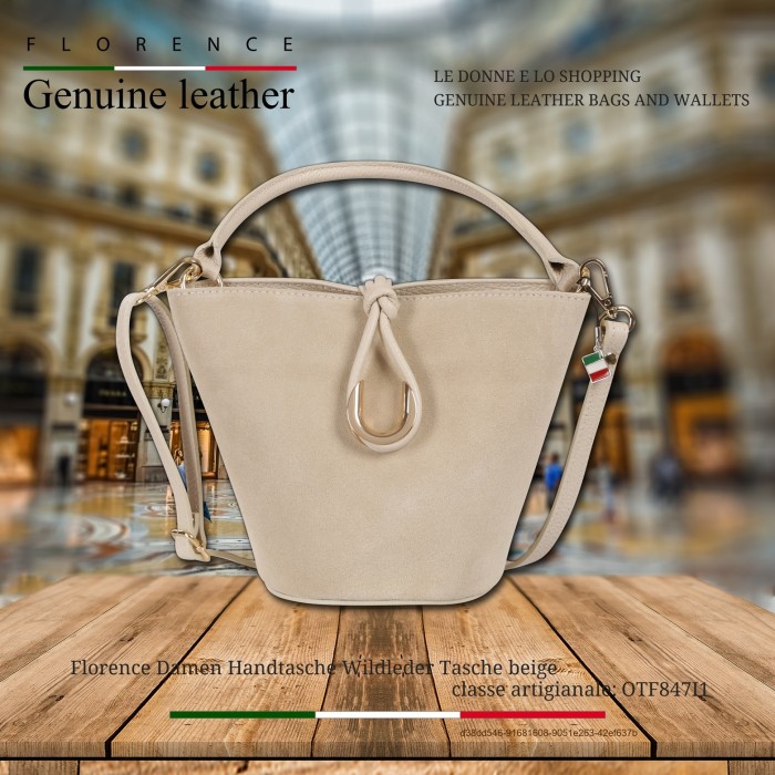 Die hochwertige Handtasche von Florence ist eine modische Tasche aus weichem, italienischem Wildleder. Diese Echtledertasche verfügt über einen Reißverschluss und zusätzlich einem Knotenverschluss mit goldfarbenem Metallring. Sie ist sehr gut geeignet für den täglichen Gebrauch, da man alles wichtige unterbringen kann. Sie kann in der Hand getragen werden oder auch mit dem zusätzlichem Gurt über der Schulter. Die Höhe der Tasche ist ca. 18cm.- Besonderheiten: