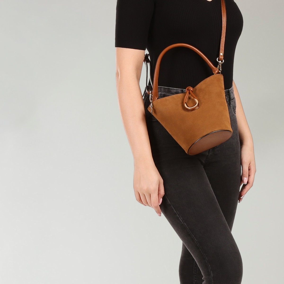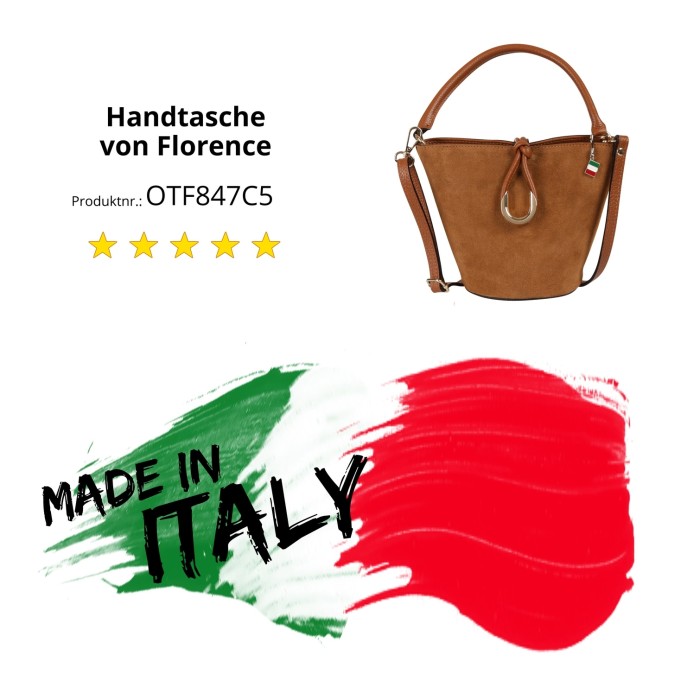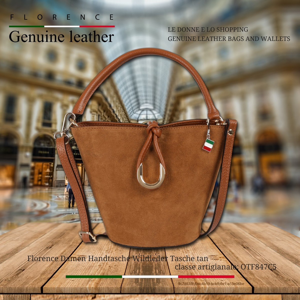 Die hochwertige Handtasche von Florence ist eine modische Tasche aus weichem, italienischem Wildleder. Diese Echtledertasche verfügt über einen Reißverschluss und zusätzlich einem Knotenverschluss mit goldfarbenem Metallring. Sie ist sehr gut geeignet für den täglichen Gebrauch, da man alles wichtige unterbringen kann. Sie kann in der Hand getragen werden oder auch mit dem zusätzlichem Gurt über der Schulter. Die Höhe der Tasche ist ca. 18cm.- Besonderheiten: