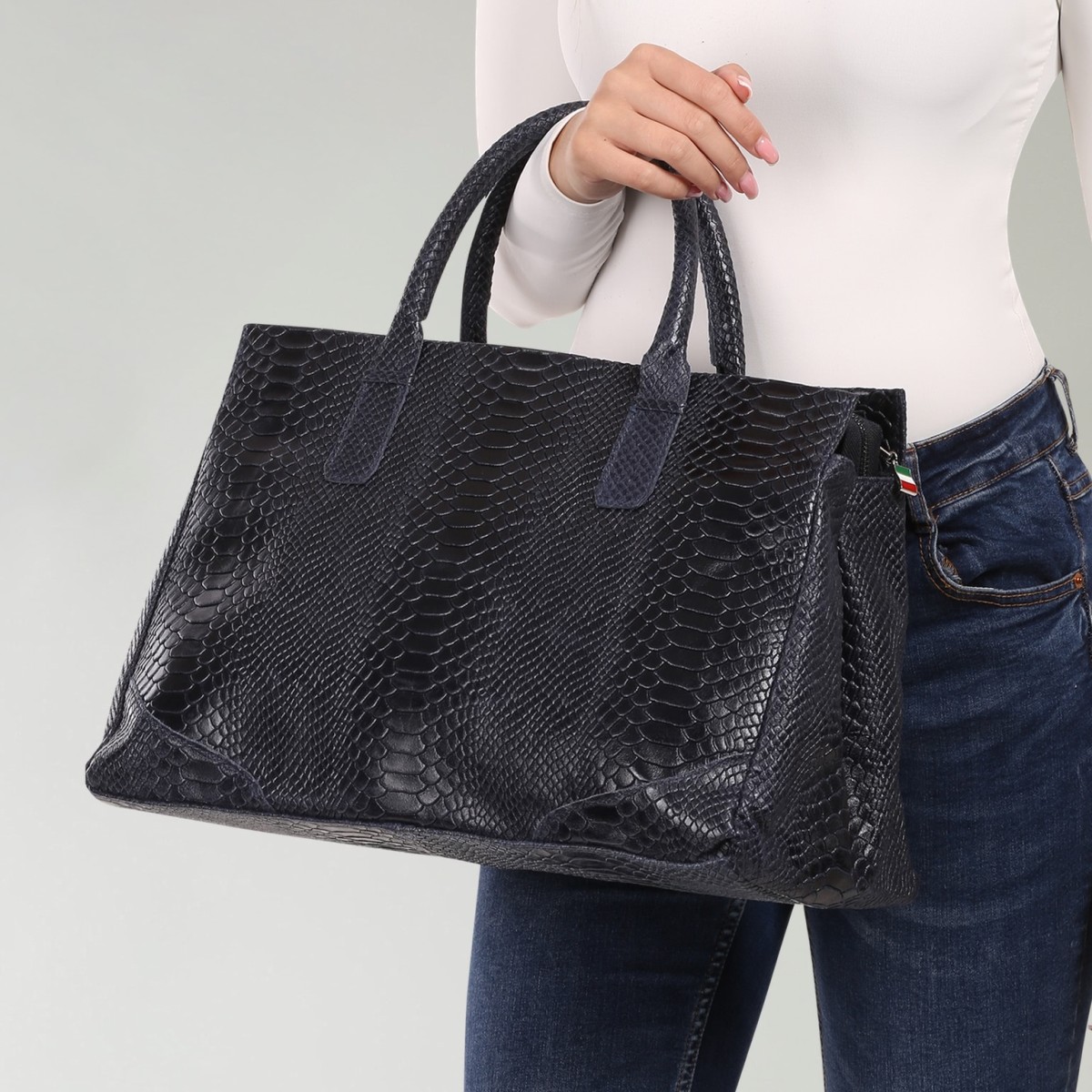 Diese hochwertige Henkeltasche Leder Damen dunkelblau Schlangenprägung Florence