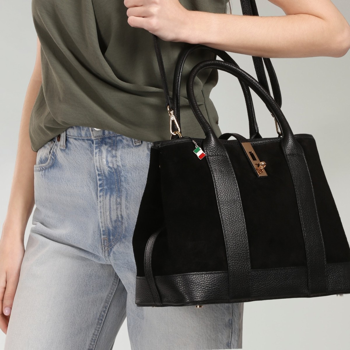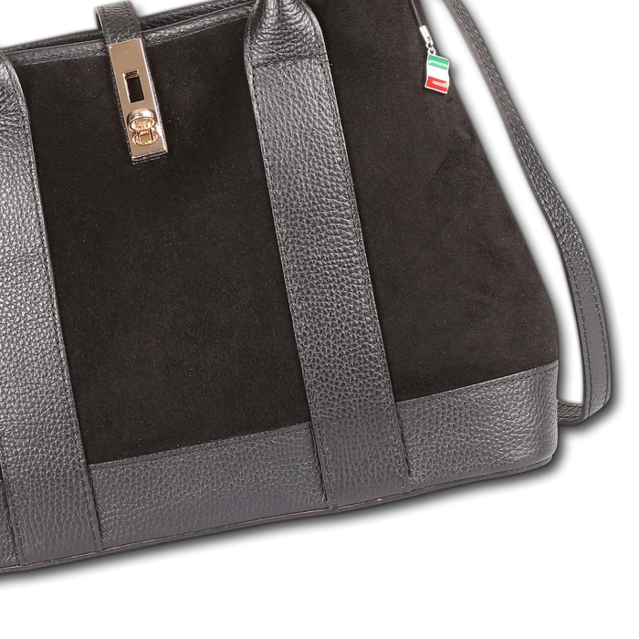 Die trendige Schultertasche von Florence ist eine stylische Tasche für den täglichen Gebrauch. Diese Echtledertasche ist aus Wildleder und einige Teile sind aus Vollnarbenleder. Man kann die großen Handgriffe lässig über dem Arm tragen und außerdem gibt es auch noch einen abnehmbaren, verstellbaren Schulterriemen. An der linken und rechten Seite kann man die Druckknöpfe öffnen und dann kann man den Schulterriemen noch besser befestigen. Verschlossen wird die Tasche mit einem Reißverschluss und zusätzlich mit einer Schnalle. Die Breite der Tasche ist ca. 36cm.- Besonderheiten:
