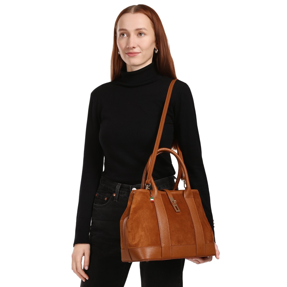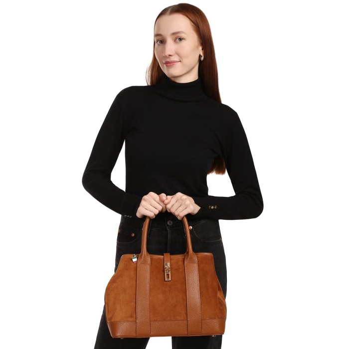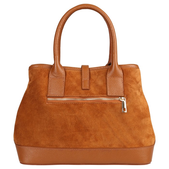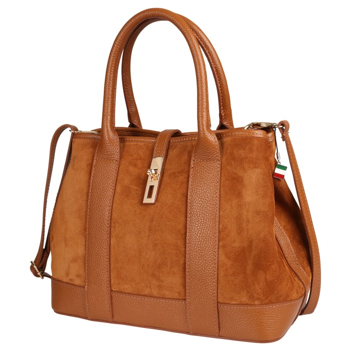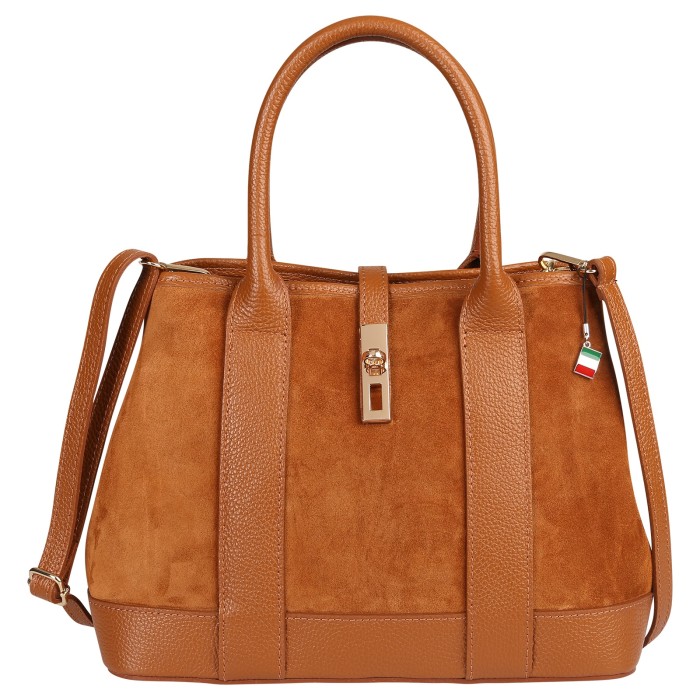 Die trendige Schultertasche von Florence ist eine stylische Tasche für den täglichen Gebrauch. Diese Echtledertasche ist aus Wildleder und einige Teile sind aus Vollnarbenleder. Man kann die großen Handgriffe lässig über dem Arm tragen und außerdem gibt es auch noch einen abnehmbaren, verstellbaren Schulterriemen. An der linken und rechten Seite kann man die Druckknöpfe öffnen und dann kann man den Schulterriemen noch besser befestigen. Verschlossen wird die Tasche mit einem Reißverschluss und zusätzlich mit einer Schnalle. Die Breite der Tasche ist ca. 36cm.- Besonderheiten: