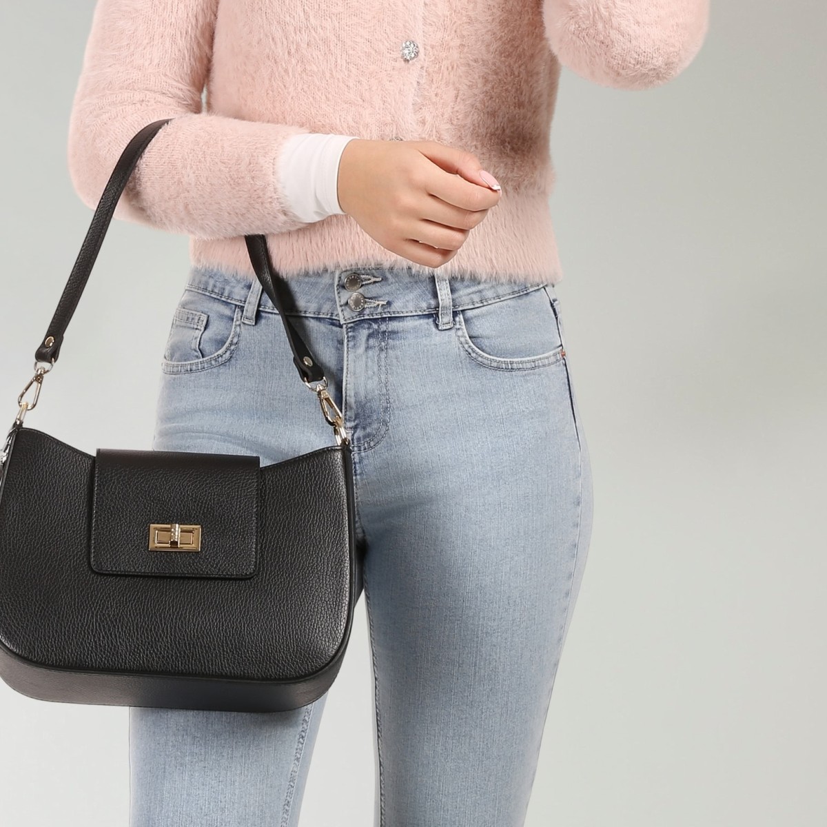 - Kurzbeschreibung: Schultertasche in schwarz mit Klipp- und Reißverschluss