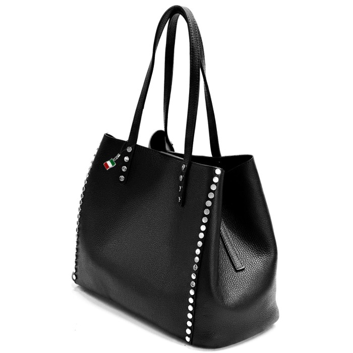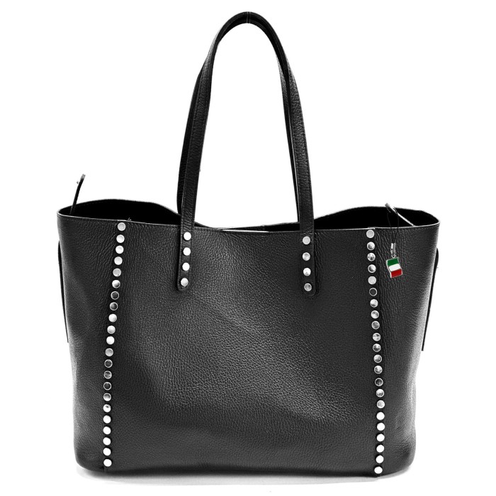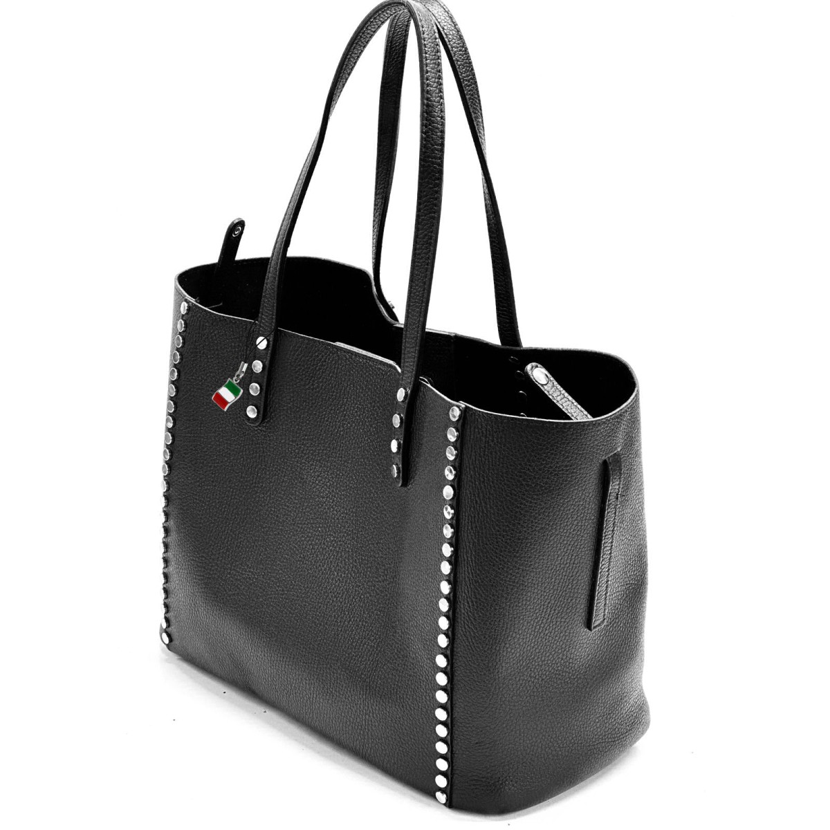 Eine große Tote Bag aus italienischem, hochwertigem, echtem Leder der Marke Florence. Diese Schultertasche überzeugt durch ihre klare und strukturierte Form und unterstreicht das modere Design durch die seitlichen Nieten. Dank des großzügigen Innenraums ist sie für den täglichen Einsatz geeignet, also für den Alltag, die Arbeit oder auch für Kurzreisen. Im inneren der Schultertasche befindet sich eine herausnehmbare Stofftasche, die zum besseren einräumen des Inhaltes genutzt werden kann. Mit den 2 stabilen Lederhenkel ermöglicht sich eine komfortables tragen über der Schulter. Im Lieferumfang enthalten ist ein kleiner Italien Flaggen-Anhänger, der am Produkt oder auch als Handyanhänger getragen werden kann.- Besonderheiten: