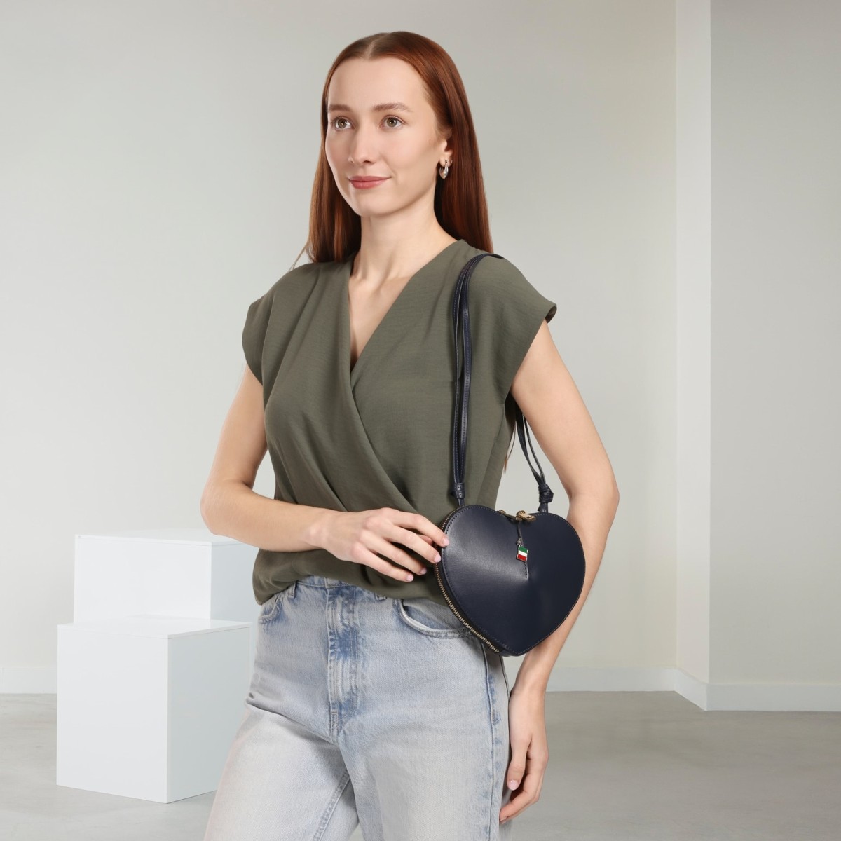 Diese modische Schultertasche besticht durch die raffinierte Herz-Form und ist Made in Italy. Sie wird mit einem Reißverschluss verschlossen. Tragen sie die Ledertasche über der Schulter oder crossbody am Körper. Diese moderne Design-Tasche hat eine Größe: klein 22cm x 16cm.- Besonderheiten: