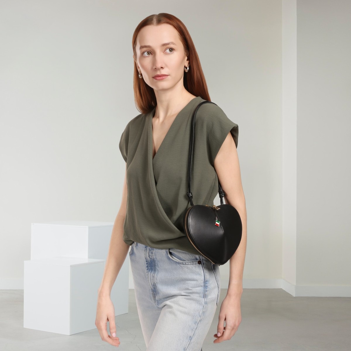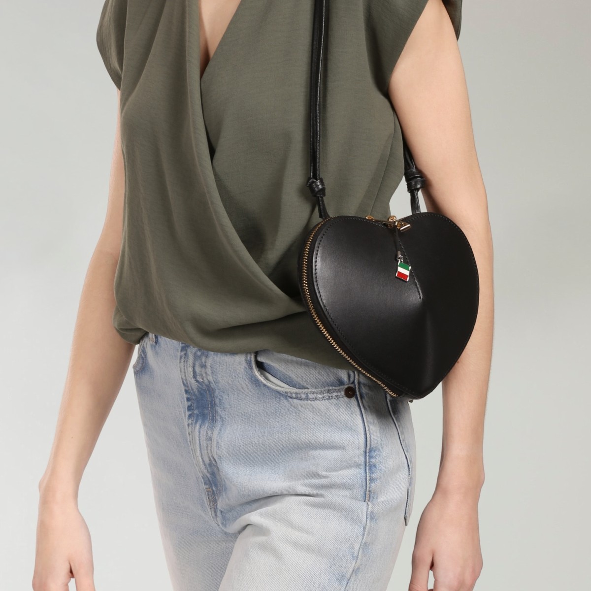 Diese modische Schultertasche besticht durch die raffinierte Herz-Form und ist Made in Italy. Sie wird mit einem Reißverschluss verschlossen. Tragen sie die Ledertasche über der Schulter oder crossbody am Körper. Diese moderne Design-Tasche hat eine Größe: klein 22cm x 16cm.- Besonderheiten:
