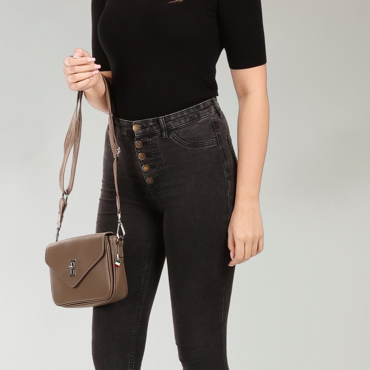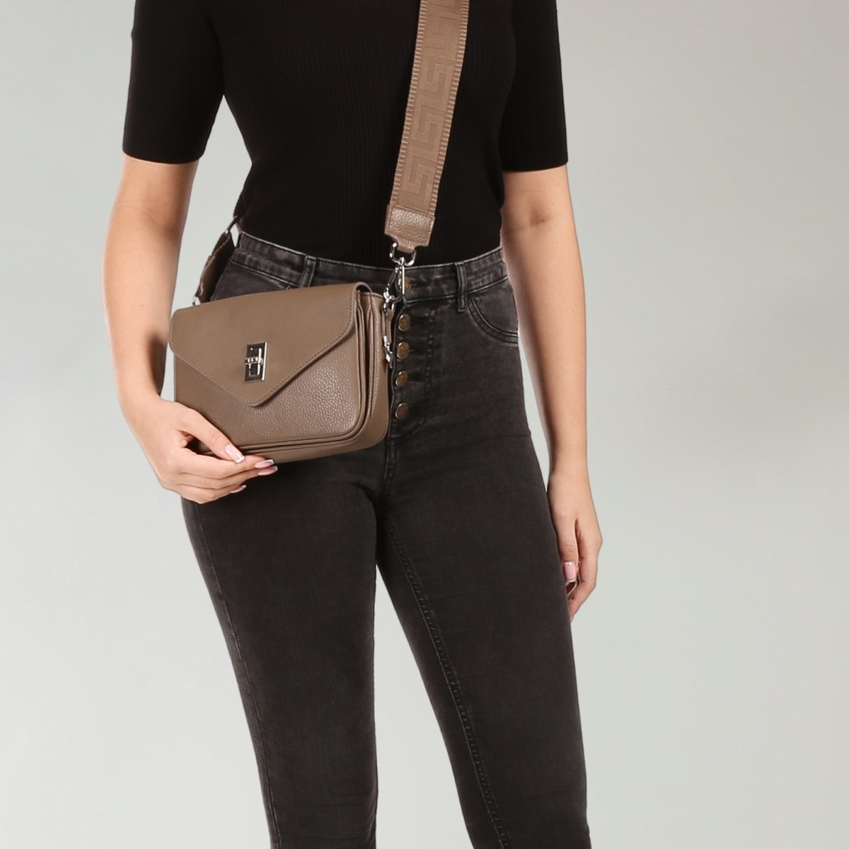 - Kurzbeschreibung: Umhängetasche taupe mit Klippverschluss und Reißverschluss