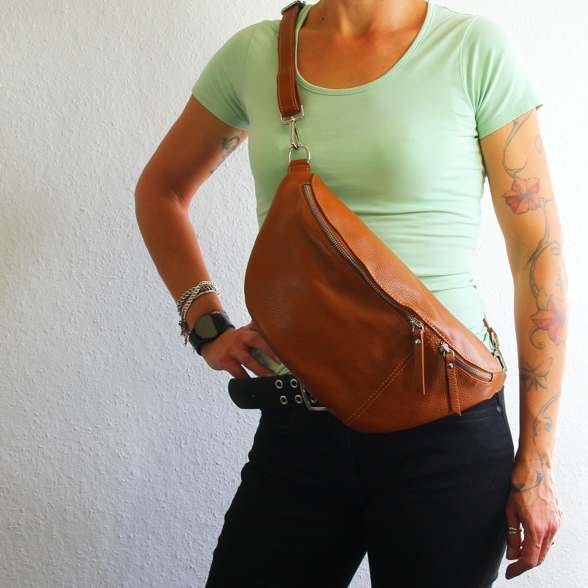 - längenverstellbarer Tragegurt passend zur Lederfarbe