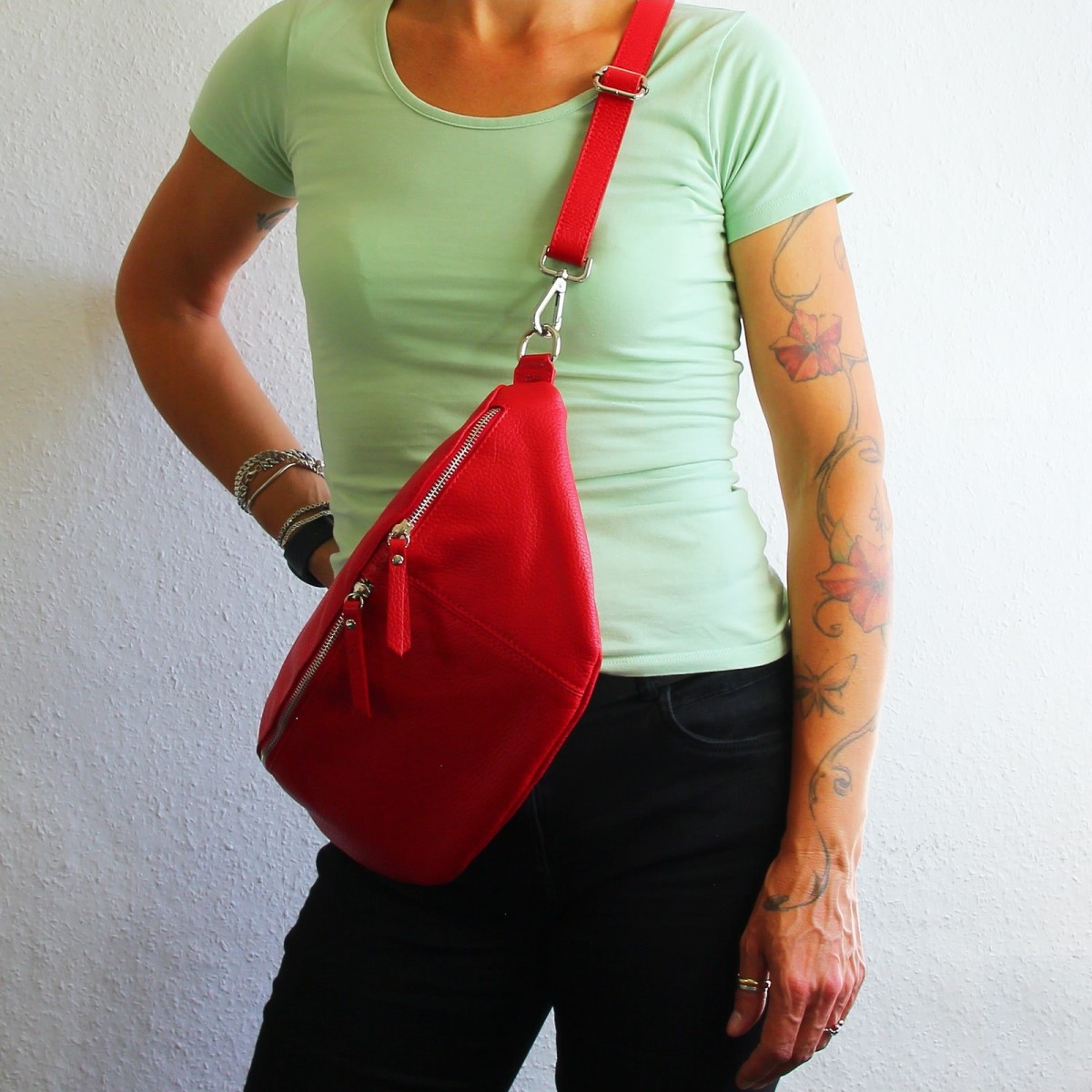 - längenverstellbarer Tragegurt passend zur Lederfarbe