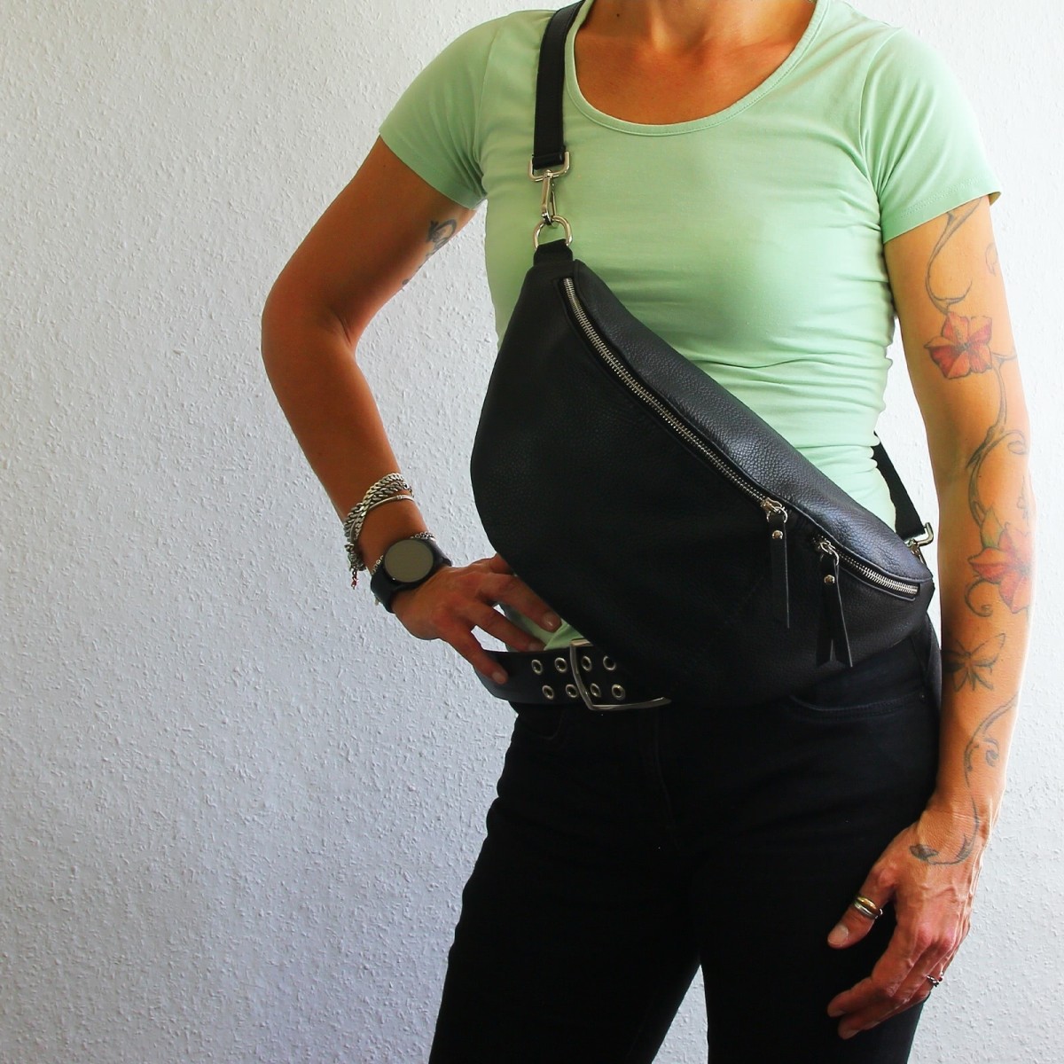 - Kurzbeschreibung: Sehr große Gürteltasche in schwarz aus Echt-Leder Damen