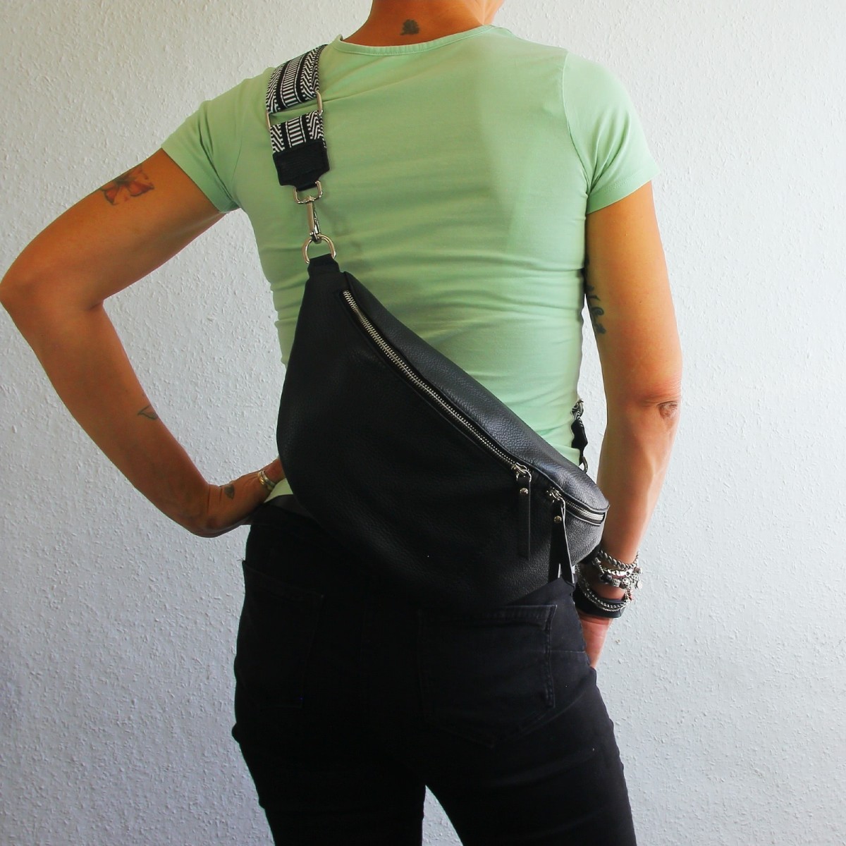 Große Gürteltasche Leder schwarz Damen, Jugend Bauchtasche inklusive 2 Gurte - Florence