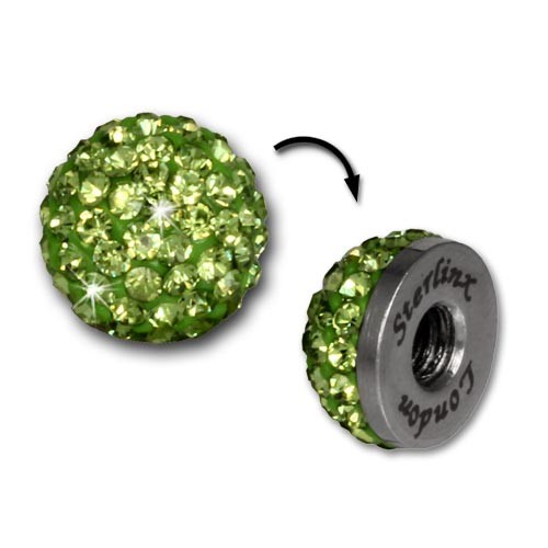 Glitzerkugel hellgrün mit Gewinde für ein SterlinX London Shamballa Armband mit Kugel-Fassungen. Die Glitzerkugel ist besetzt mit funkelnden tschechischen Preciosa Zirkonias und hat ein Edelstahlgewinde zum Befestigen (Stainless Steel). Zum Tragen benötigen Sie ein Armband mit Glitzerkugelfassungen aus der Sterlinx London Kollektion.