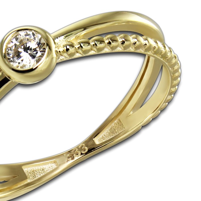 Ein zarter Goldring - Crossed - aus unserer einzigartigen GoldDream Echtschmuck Kollektion. Der weiße Zirkonia funkelt und glitzert auf dem gekreuztem Ring und ist auf einer Ringschiene mit einem Muster verziert. Der Ring ist aus anlaufgeschütztem 333er Gelbgold (8-Karat) und hat eine Größe von 58mm Umfang und einen Innendurchmesser von 18,5mm. Es gibt den Goldring auch in den Größen 54, 56 und 60.