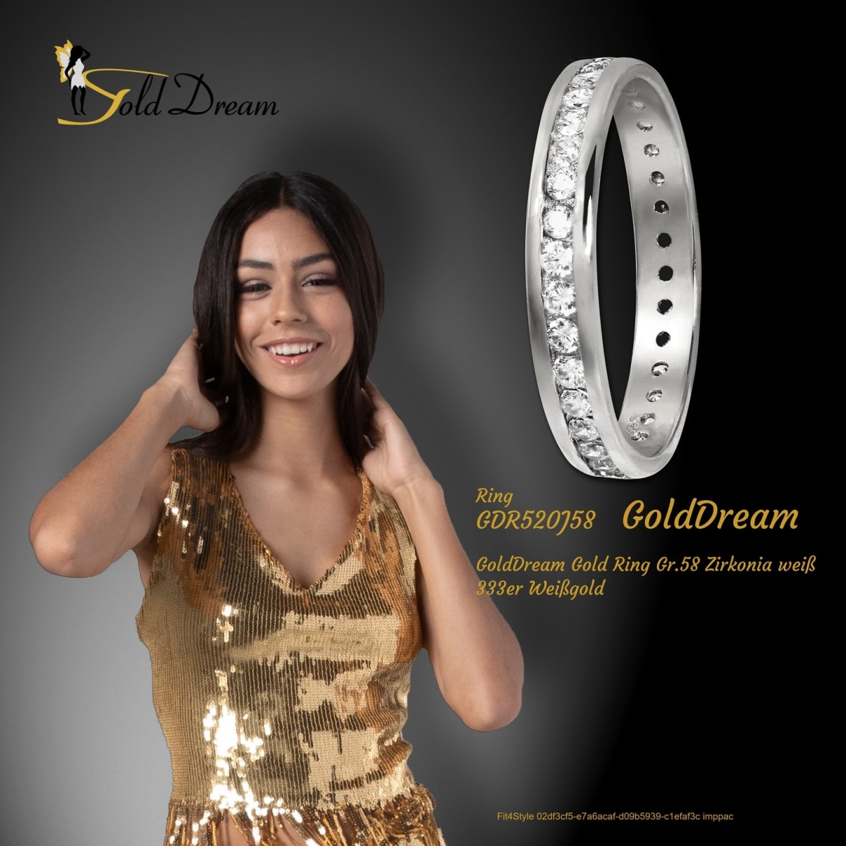 Ein edler Goldring runderherum mit Zirkonia weiß aus unserer einzigartigen GoldDream Echtschmuck Kollektion. Der Zirkonia-Ring ist aus anlaufgeschütztem 333er Weißgold (8-Karat). Der Ring hat eine Größe von 58mm Umfang und einen Innendurchmesser von 18,5mm. Es gibt den Goldring auch in den Größen 54, 56 und 60.