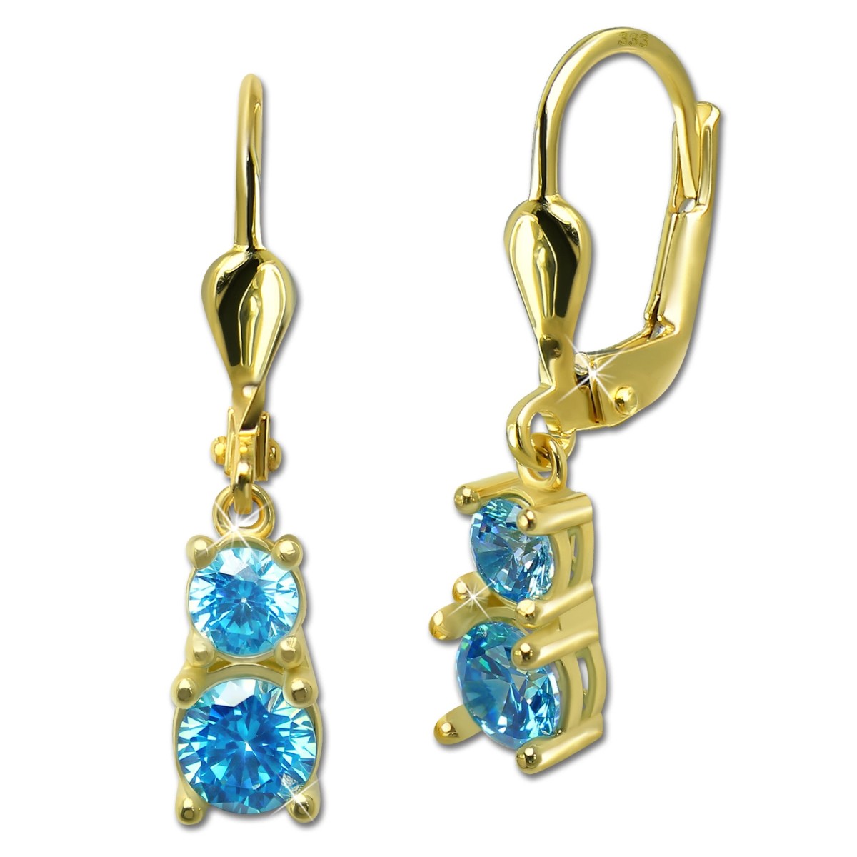 Ein Paar Ohrhänger - Dream - mit funkelnden Zirkonia besetzt. Auf den Ohrringe sind zwei leuchtende türkisfarbene Zirkonia-Steine eingelassen. Die 8 Karat Ohrringe sind aus unserer einzigartigen GoldDream Echtschmuck Kollektion aus 333er Gelbgold.