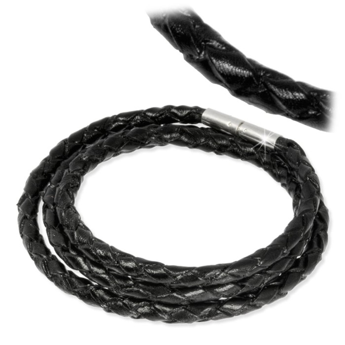 Ein dreifach gewickeltes Leder Armband geflochten in der Farbe schwarz mit Sterling Silber 925er Bajonett Verschluss. Die Breite des Bandes ist 3mm und die Länge bei dreifacher Wicklung ist 20cm. Das Lederarmband hat eine Gesamtlänge von 60cm. Dieses Lederband eignet sich auch hervorragend zum tragen als Kette!
